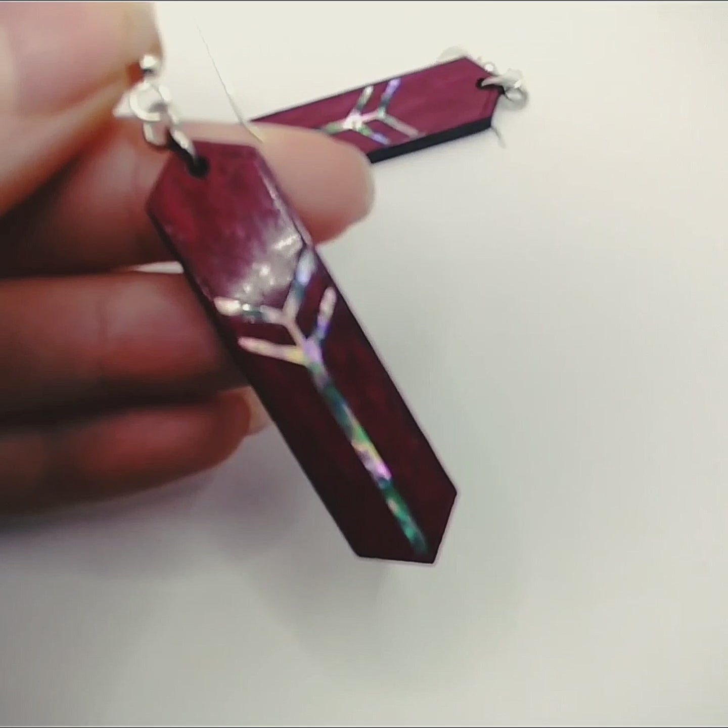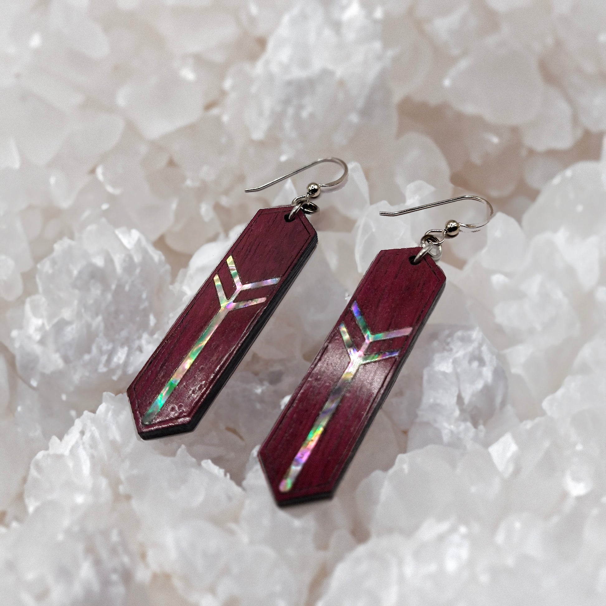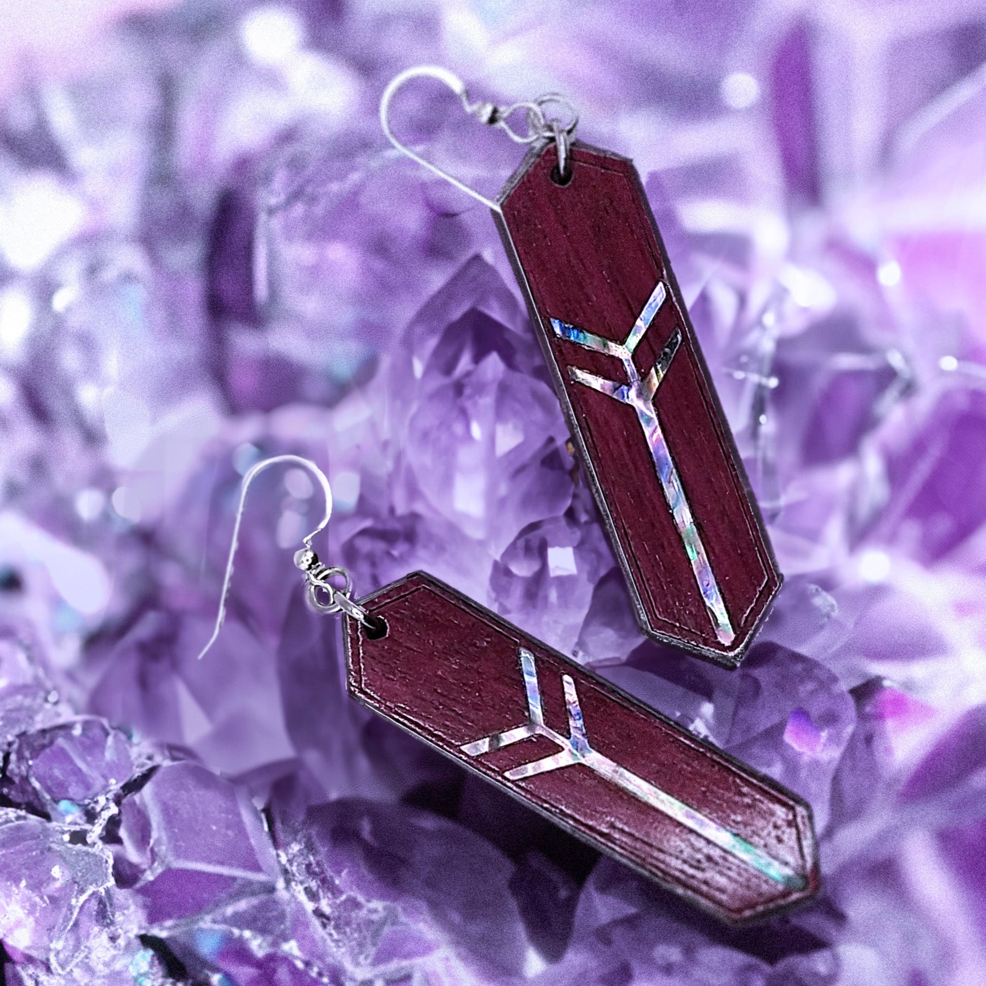 Embrace the enchantment of our "Arcane Reflection" earrings, handcrafted for the soulful individual. Meticulously made from rich purple heart wood and iridescent mother of pearl, they dangle delicately with sterling silver hooks. Each pair, fashioned in our USA studio, is a bespoke work of art, echoing the wisdom of nature and the mystique of the spiritual path.