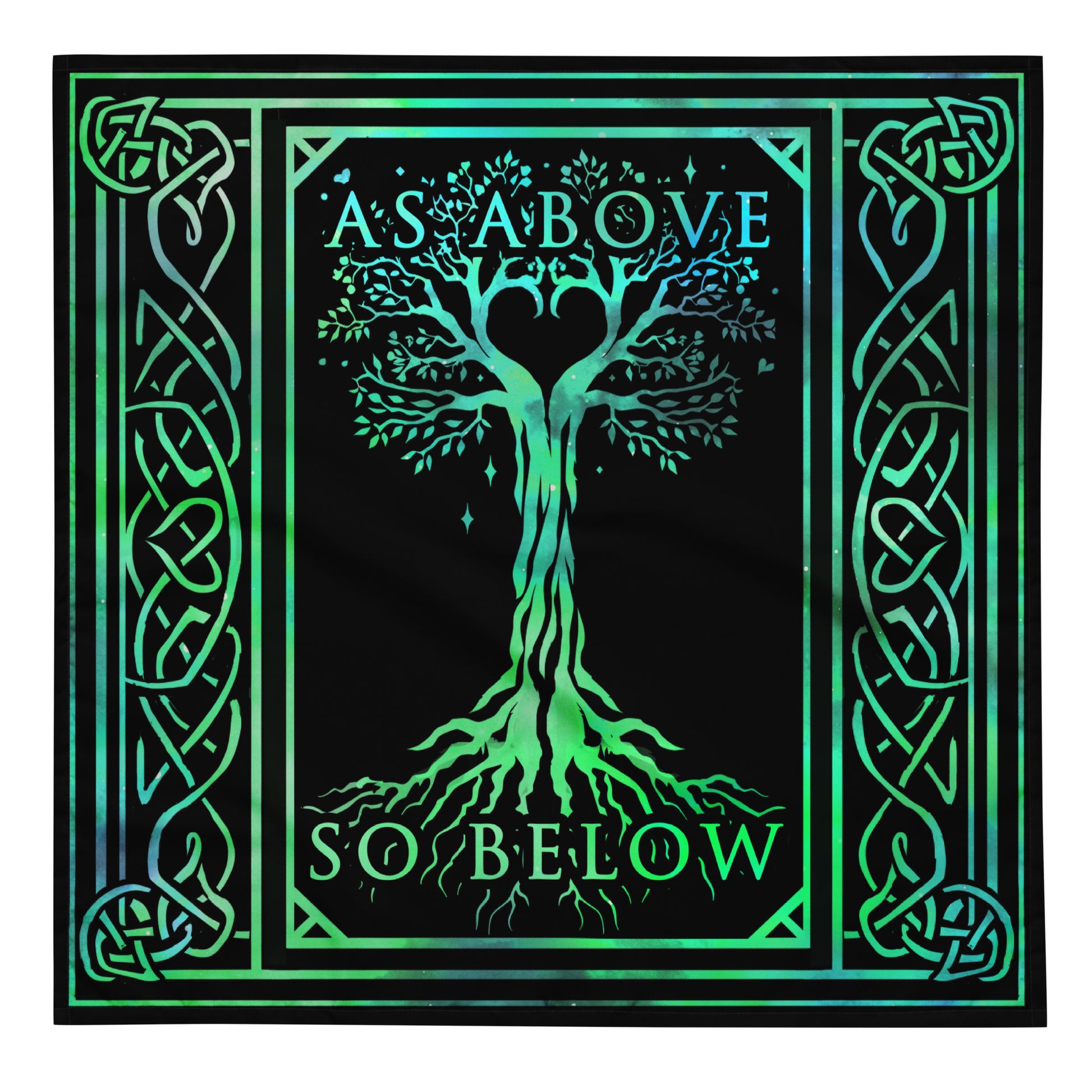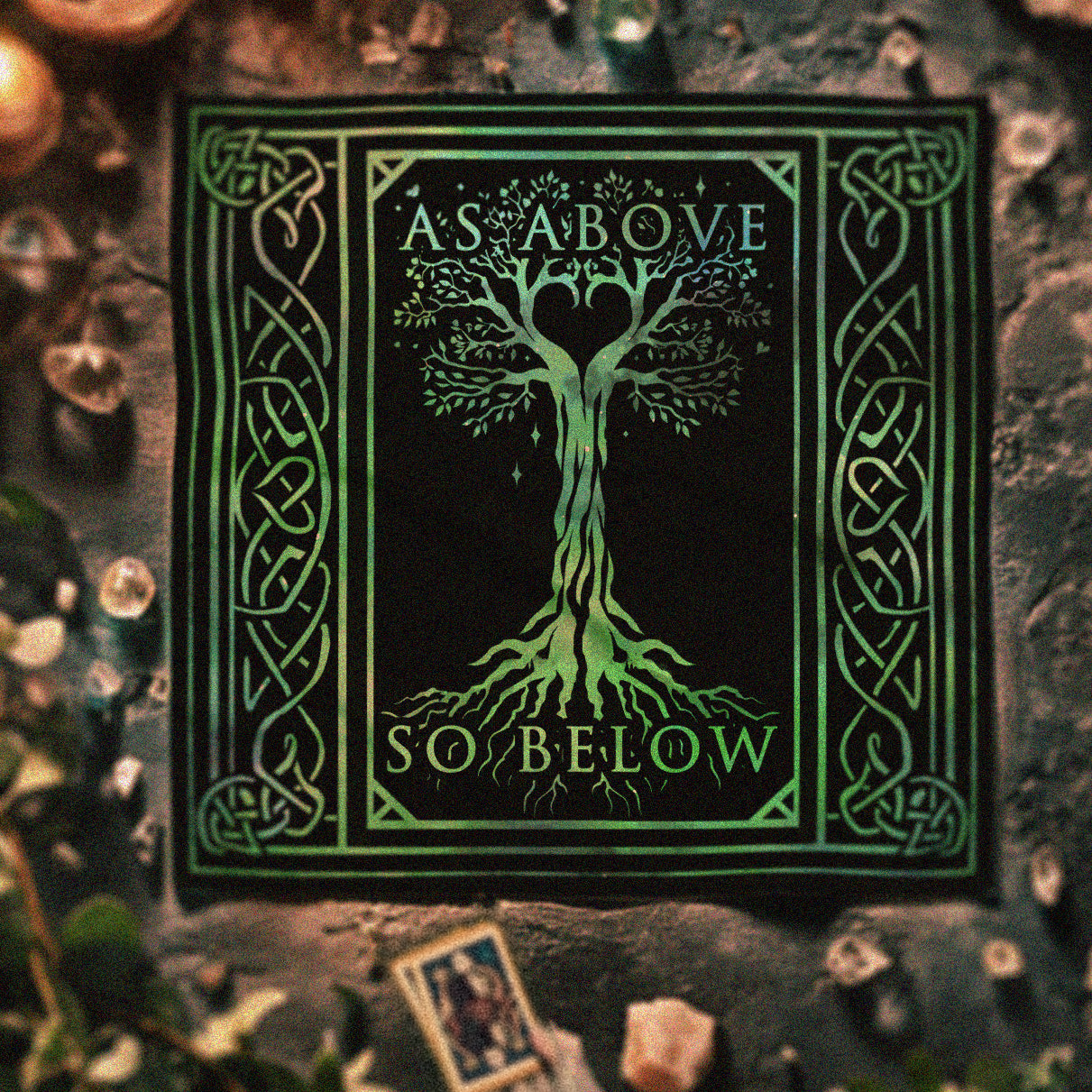Infuse your spiritual practice with profound symbolism using our "As Above, So Below" Pagan Tree tarot altar cloth. Measuring 25 x 25 inches, this stunning cloth features a captivating green and black design that enhances the ambiance of any altar or sacred space.