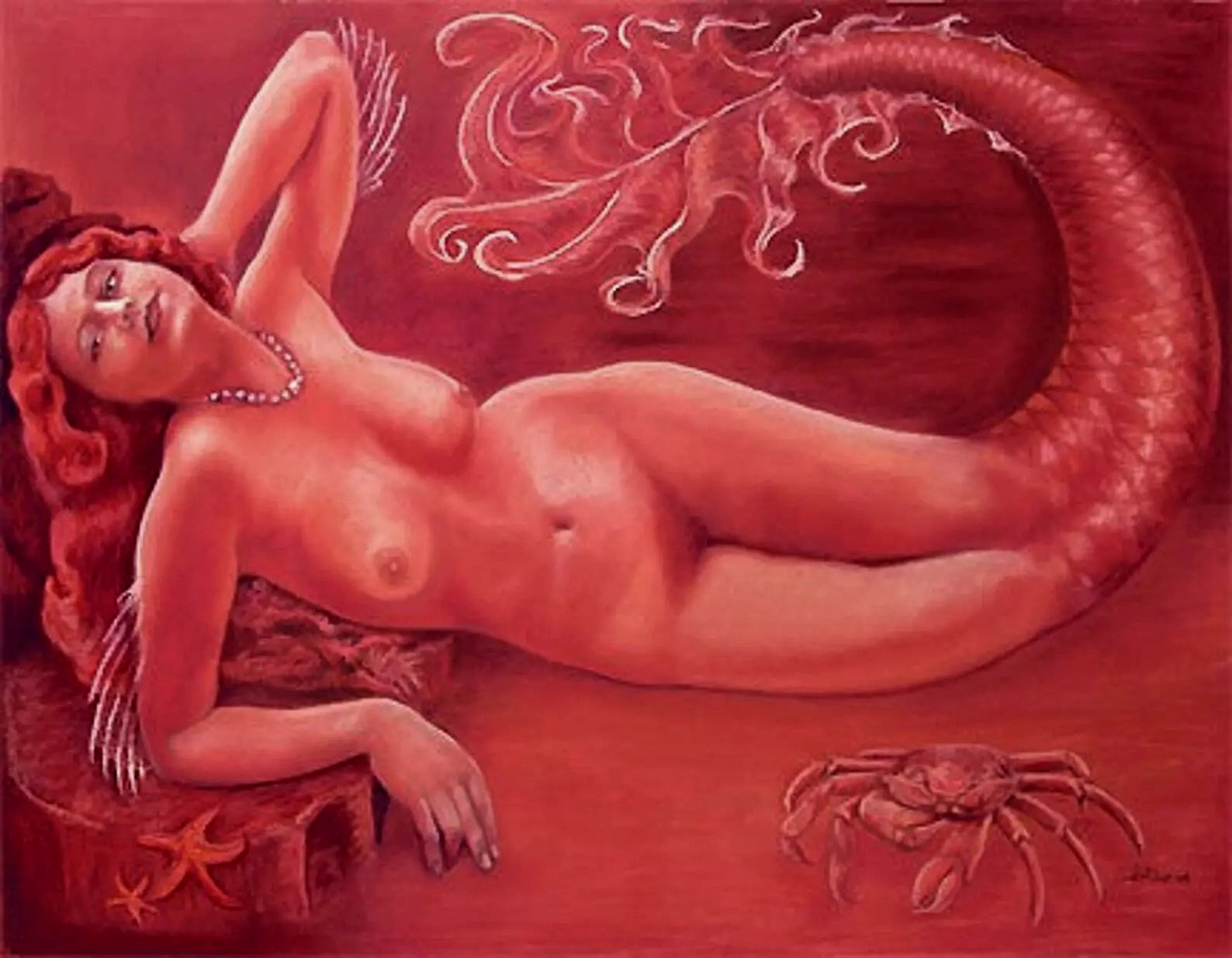 "Ruby," a captivating addition to the Vintage Mermaids Series. This stunning artwork captures the allure and mystique of a mermaid with rich red tones and intricate details, creating a mesmerizing and evocative scene that draws viewers into a world of fantasy and beauty. The mermaid's graceful pose and serene expression, surrounded by ocean elements like the starfish and crab, make this piece a perfect statement for any art collection.