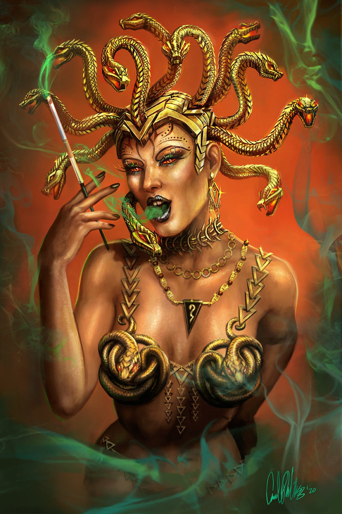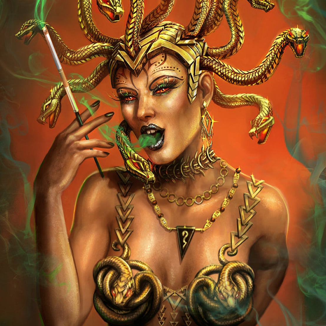 In this striking portrait, the character is depicted smoking a long cigarette holder as serpents coil around her head, creating a visually captivating and intense piece perfect for lovers of bizarre art, fantasy illustration, and dark, alternative decor.