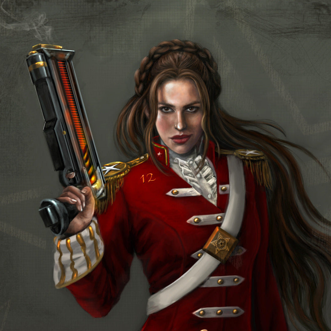 Wearing a bold red military coat adorned with gold details, Lt. Kilos exudes both authority and style. Her white trousers and knee-high black boots complement her strong, confident stance, while her flowing brown hair adds a dynamic, feminine touch. Armed with a futuristic steampunk gun, she is ready for action, embodying the perfect blend that defines the steampunk genre.