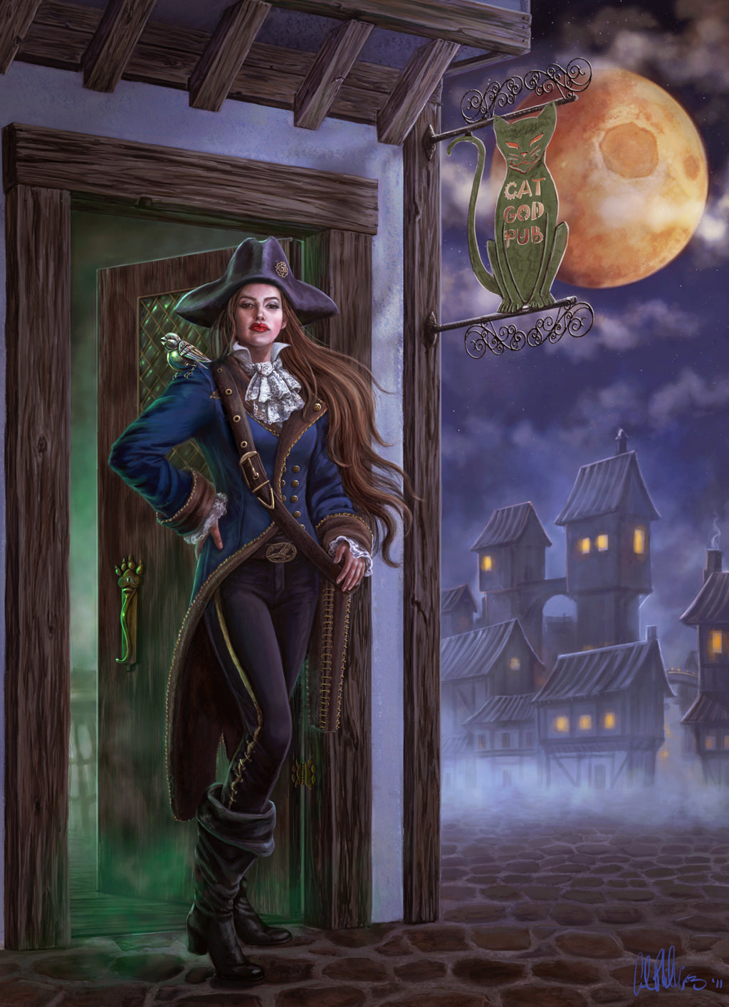 This print depicts Lt. Kilos, friend and 1st officer and good friend to the famed Captain Davage. She is at one of her favorite hang out spots the mysterious cat god pub