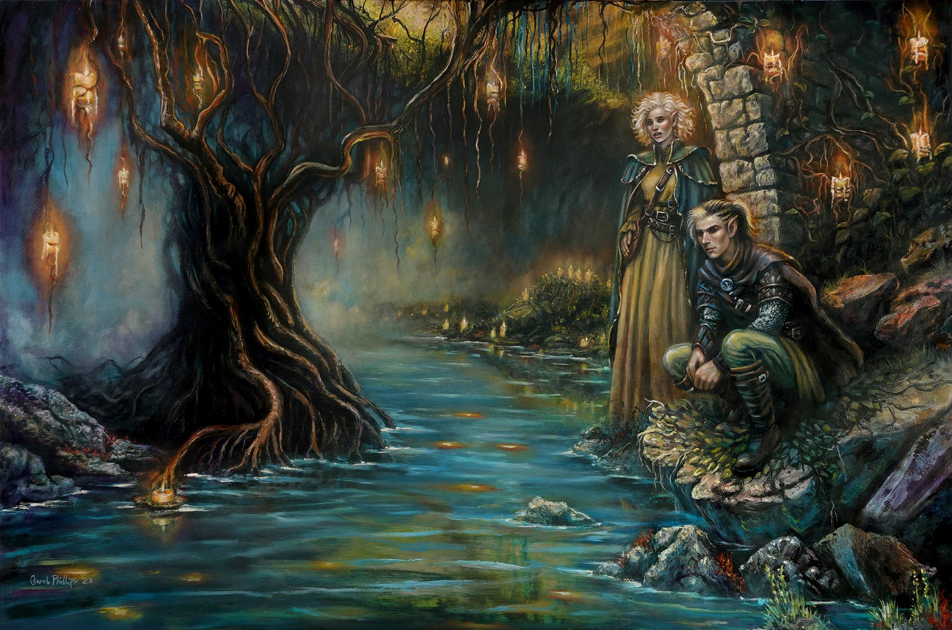 Depicted in the artwork are the series' main characters, Adrianna and Dinim, as they stumble upon a wondrous scene: a magical pool nestled within a cavern, dominated by a mystical root column that reaches skyward.