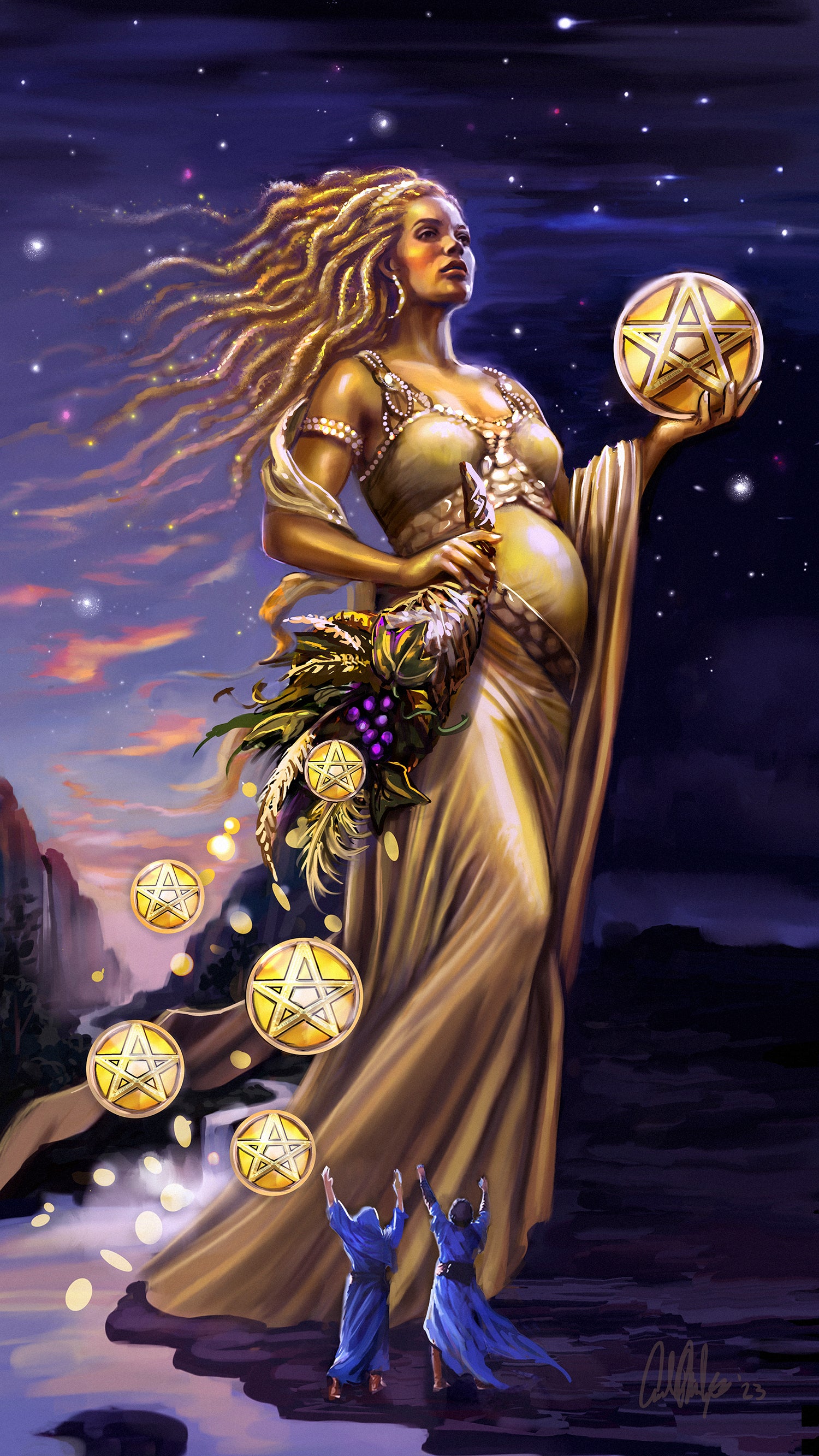 The Six of Coins Card:The Six of Coins tarot card embodies the principles of generosity, charity, and the cyclical nature of giving and receiving. Often depicted as a well-dressed figure distributing coins to beggars, the card emphasizes the balance between wealth and poverty, and the responsibilities that come with abundance. It's a reminder that prosperity is not just for self-indulgence, but also to be shared with those less fortunate, fostering a sense of community and interconnectedness. Paired with the image of Goddess Abundantia, the Roman deity of abundance and prosperity, the message deepens. Abundantia, with her overflowing cornucopia, signifies not only material wealth but also a bounty of spiritual richness and emotional well-being. Together, the Six of Coins and Goddess Abundantia call upon us to recognize the abundance in our lives and inspire us to distribute our blessings, ensuring that the flow of prosperity continues and enriches everyone involved.