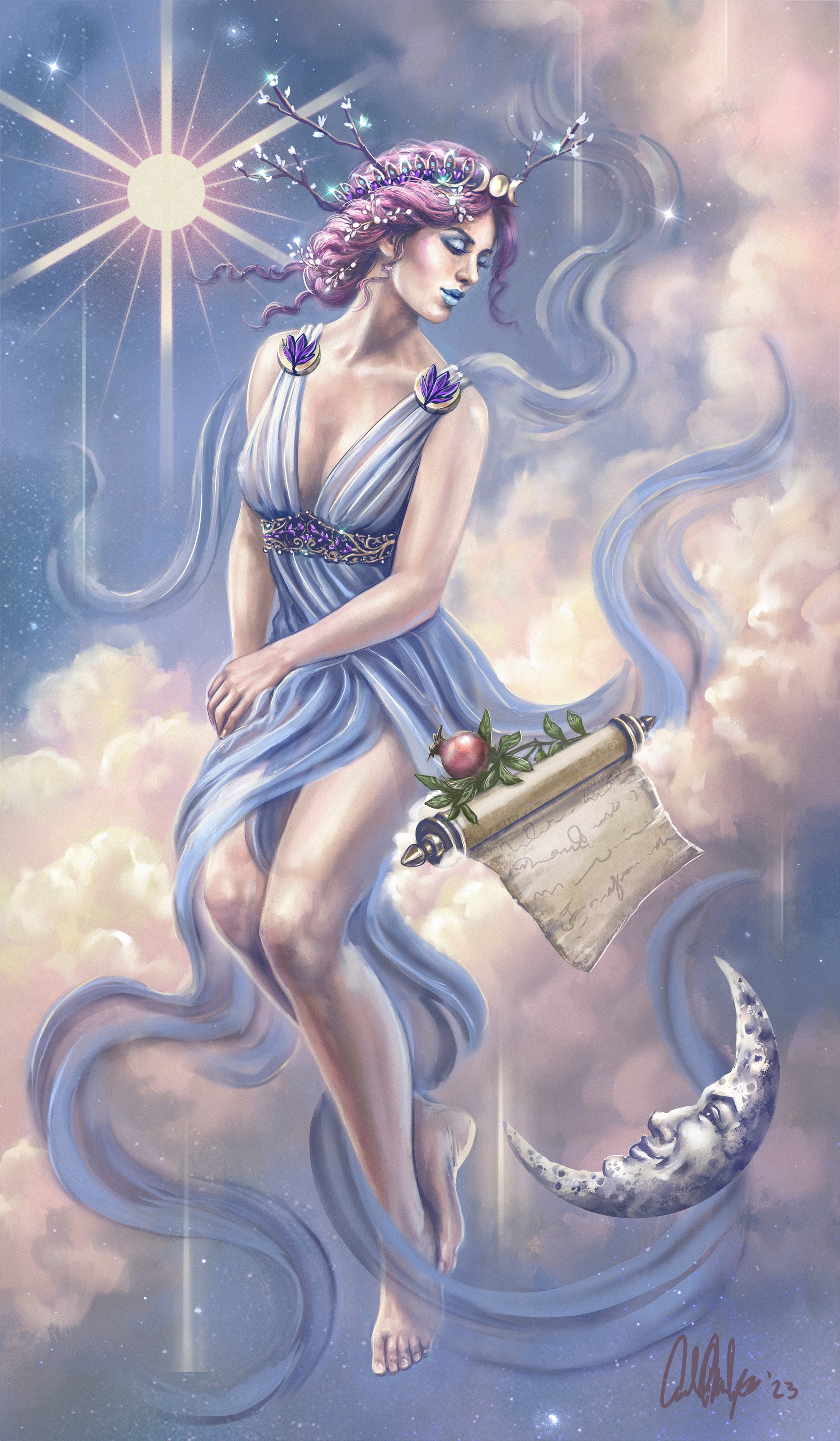 The High Priestess Card: The High Priestess tarot card, when envisioned with Persephone as its central figure, takes on a profound depth of mystery and duality. Persephone, the Greek goddess who divides her time between the Underworld and the world of the living, embodies the balance between light and dark, conscious and subconscious. As the High Priestess sits in quiet contemplation, she channels the energies of intuition, inner wisdom, and the secrets of the unknown. Just as Persephone traverses between two realms, the High Priestess card beckons us to explore the depths of our inner world, urging us to trust our intuition and embrace the wisdom that resides within. This rendition of the card serves as a powerful reminder of the transformative power of introspection and the rich tapestry of the inner self.