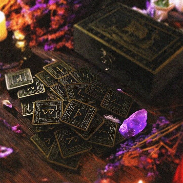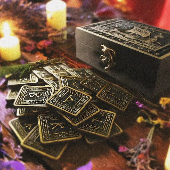 Enhance your divination practice with this complete set of 24 engraved Elder Futhark runes, housed in a beautifully intricate wooden box. Each rune is carefully engraved and finished, making this portable set perfect for both beginners and experienced practitioners of Norse paganism, Asatru, and other pagan paths.