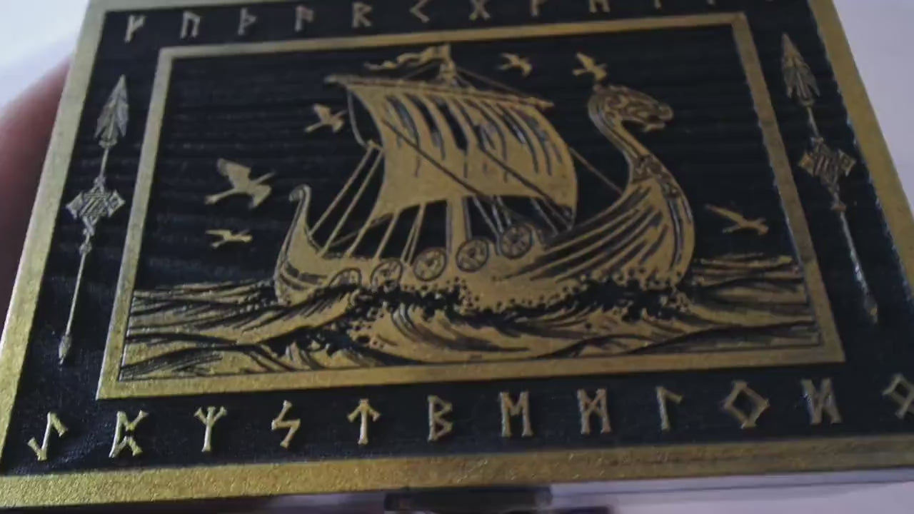Intricate engraved wooden box (6" x 4" x 2") with Viking Dragon Ship, Elder Futhark Runes and Gugnir (Odin's Spear) design